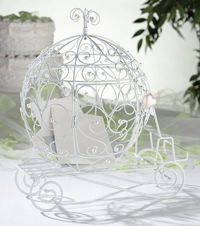 This charming white metal card holder is designed to look like a classic fairy tale coach. It is decorated with beads and measures 15" x 16.5". There is a slot on one side (5" x 1.25") for inserting the cards and a door on the opposite side for taking cards out after the reception. There is also a removable beaded heart chain that can be used to lock the door while in use.