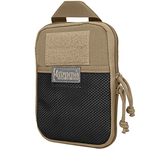 Maxpedition E.D.C. Pocket Organizer Khaki. Compact design. Measures 5" x 7" x 3/4". Fits neatly into pants cargo pocket or backpack/bag. Full clamshell opening main compartment with dual zippers. Inside left has slip pocket, keyring, and elastic organizer with 9 divisions. Inside right has slip pocket, tie-down loop, elastic organizer with 6 divisions. Front exterior features 2" x 3" loop field for patches and mesh slip pocket with hook-and-loop closure. Back exterior features oversized handle and attachment webbing. MOLLE compatible. Attach using two 3" TacTie Attachment Straps (sold separately). Color: Black.